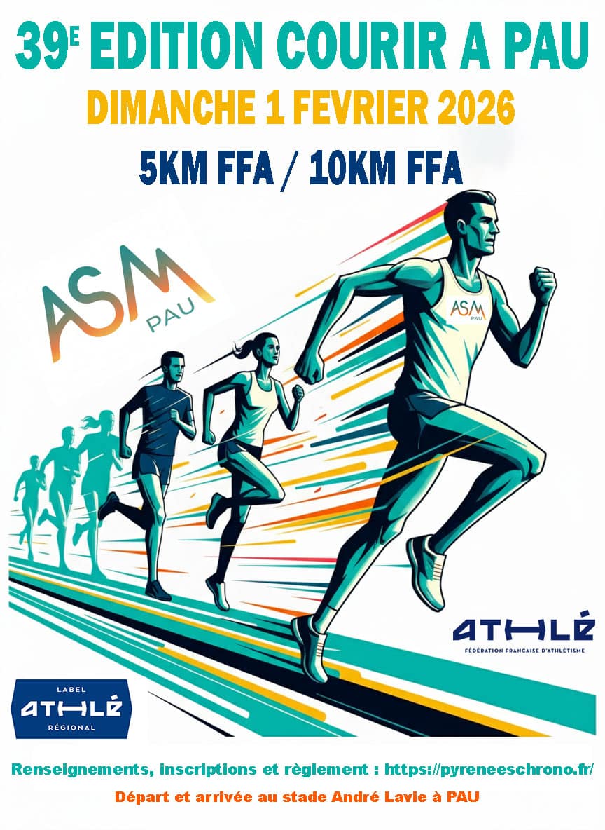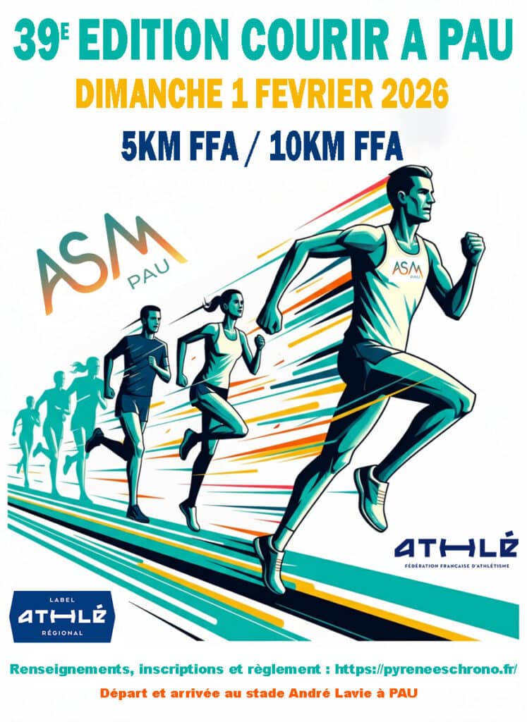 L’association ASM section Course sur Route et Marche organise le 01 février 2026 la 39ème édition de Courir à Pau avec un nouveau parcours. Un événement emblématique pour la Ville de Pau et son territoire. Que ce soit pour améliorer votre chrono, vous challenger ou tout simplement passer un bon moment en famille ou entre amis, venez découvrir ce parcours roulant qui se clôt sur la piste du stade André Lavie, devant un public nombreux.