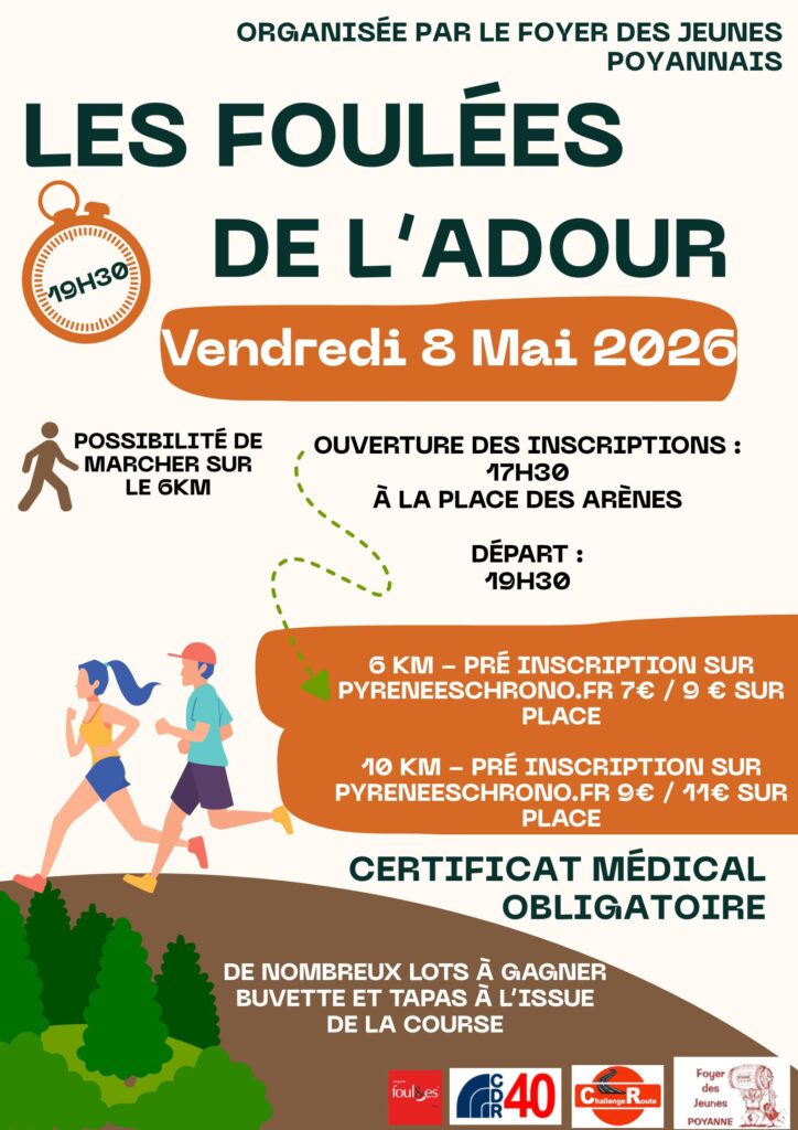 Le Foyer des Jeunes Poyannais organise sa 7e édition des Foulées de l’Adour. Au programme 2 courses de 6 et 10km et une marche sur le parcours du 6km.