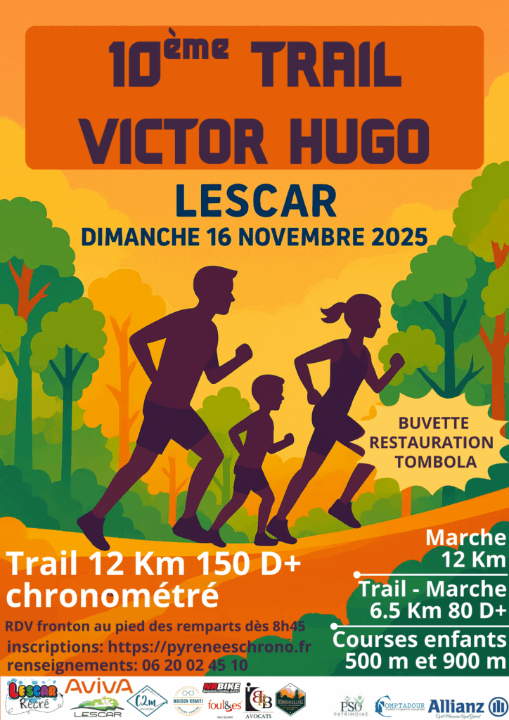 L’association de parents d’élèves LESCAR RECRE organise la 10ème édition de son Trail et sa Marche Victor Hugo qui auront lieu le dimanche 16 Novembre à LESCAR.