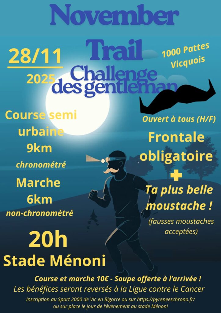 Les 1000 Pattes Vicquois sont fiers de vous inviter à la toute première édition du November Trail, une aventure nocturne ouverte à toutes et tous, coureurs comme marcheurs, dans une ambiance conviviale et solidaire ! 💛 Un événement pour la bonne cause : Tous les bénéfices seront reversés à la Ligue contre le cancer. Venez