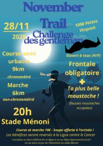 Les 1000 Pattes Vicquois sont fiers de vous inviter à la toute première édition du November Trail, une aventure nocturne ouverte à toutes et tous, ...